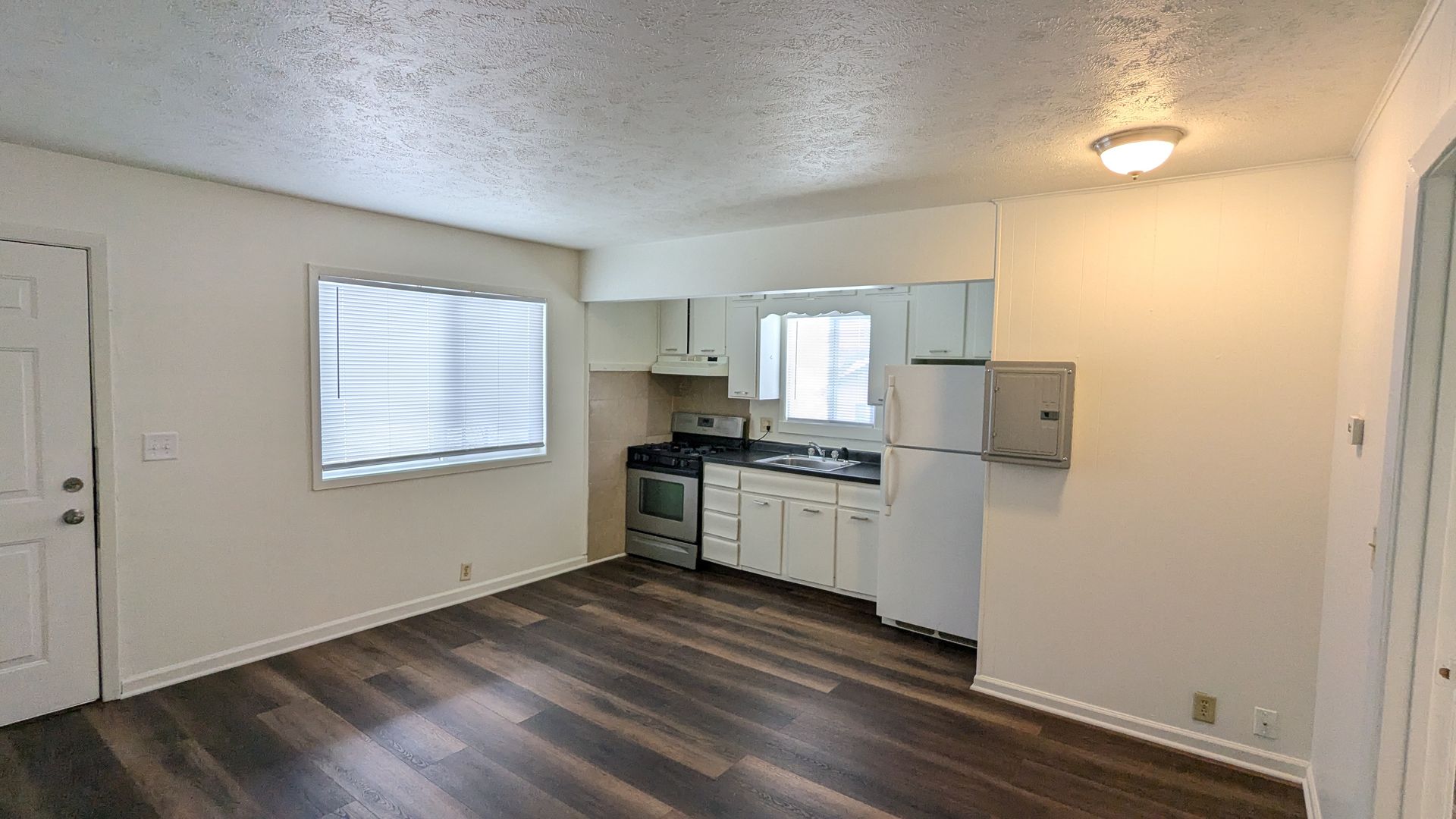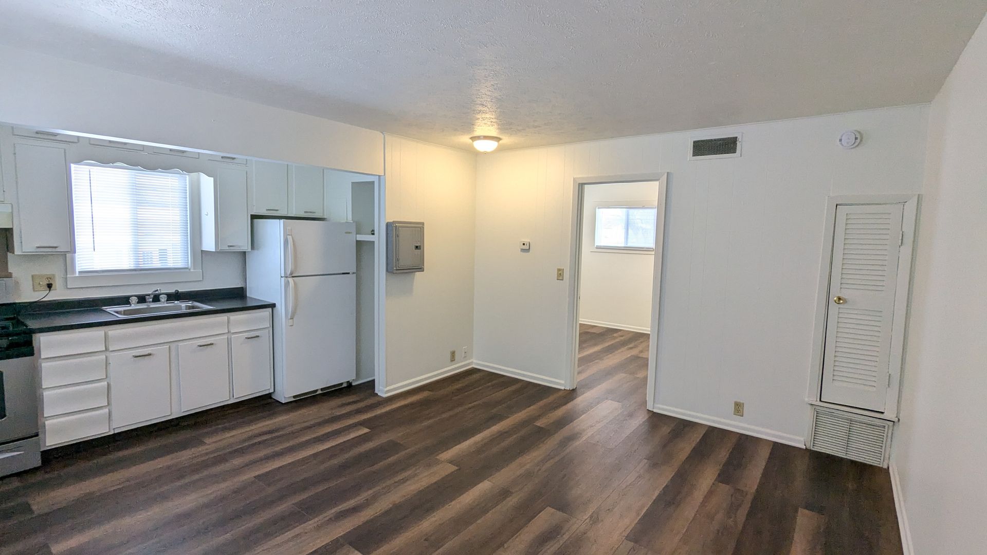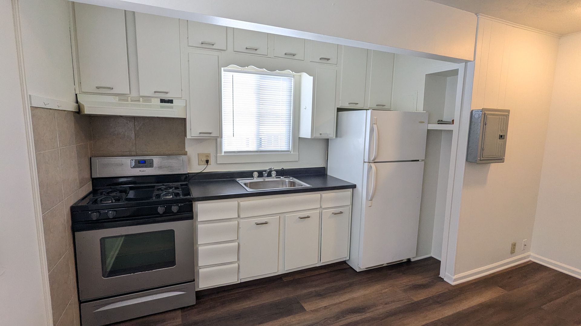 Second story 1-bedroom apartment has open kitchen/living area and central A/C. One reserved parking spot included at no extra charge. Full bathroom with wall cabinets and extra storage in vanity. Water and garbage are included; tenants are responsible for gas and electric. New flooring and paint throughout, coin laundry on ground floor.