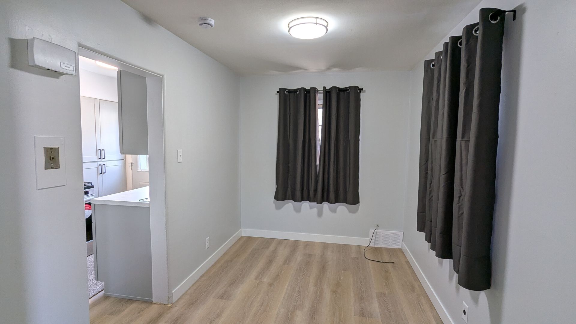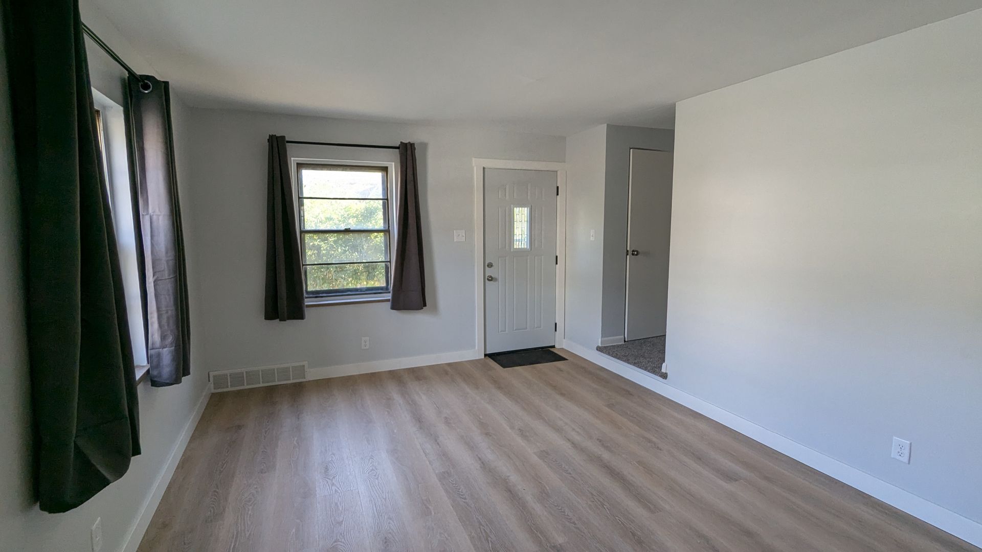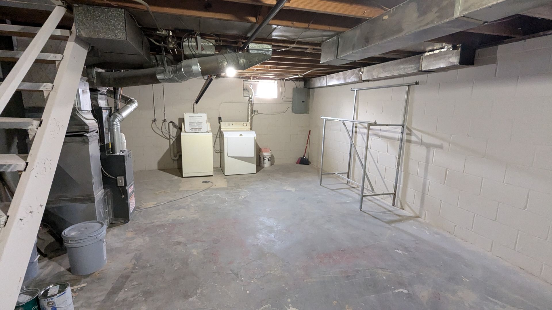 New flooring and new paint throughout, and updated kitchen with gas range and new cabinets. On the main floor are the living room, full size dining room, and kitchen. The basement is unfinished but full-size, and contains the laundry hookups. The second story is home to both bedrooms as well as the full bathroom.