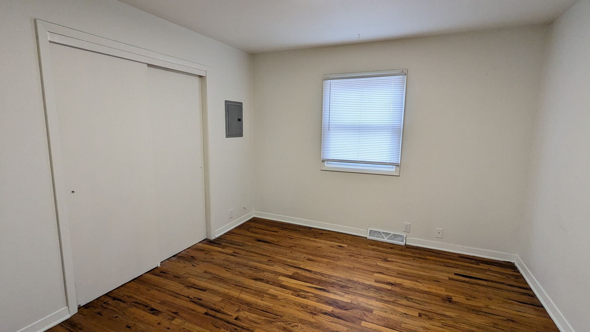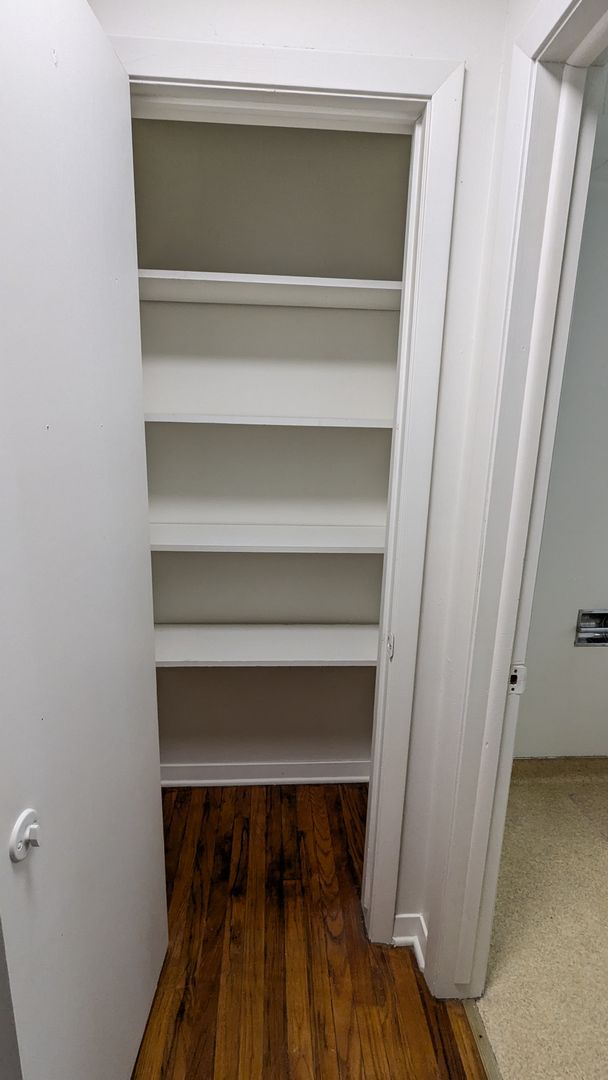 The apartment features a good-size living room with wood floors, which flows into the eat-in kitchen. Fridge and electric stove are included. On the other side of the unit is a linen closet, full bathroom, and the bedroom with nice big closet.